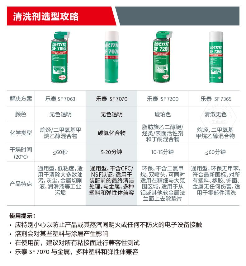 樂泰SF7070是一款溶劑型清洗劑。樂泰SF7070主打快速去污,適用于表面清潔和機(jī)械部件污垢清洗。樂泰SF7070無色透明,化學(xué)類型為碳?xì)浠衔铮?0℃下干燥時間為5-20分鐘,粘度非常低。樂泰SF7070具備快速揮發(fā)、應(yīng)用廣泛、強(qiáng)效清潔等特點(diǎn),可用于裝配前的最終清潔處理。樂泰SF7070還與金屬、多種塑料和彈性體兼容。