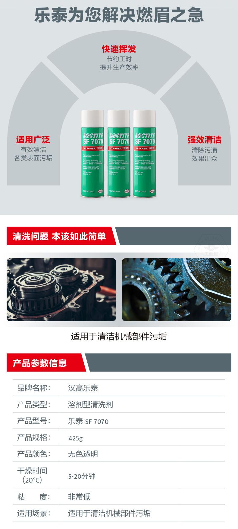 樂泰SF7070是一種無色透明溶劑型(不含氟氯烴的)部件清洗劑和脫脂劑,它經(jīng)過特別配制,可使部件與膠粘劑粘合。該產(chǎn)品適合在室溫下用做噴劑,能去除部件上的大部分油、油脂、潤滑液、金屬切削液和細(xì)粉,可安全用于鋁、橡膠和大多數(shù)塑料。