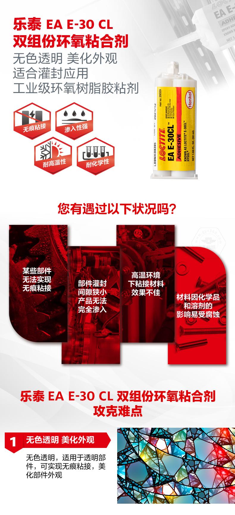樂泰EA E-30 CL雙組份環(huán)氧粘合劑是一款無色透明的工業(yè)級環(huán)氧樹脂膠粘劑。樂泰EA E-30 CL雙組份環(huán)氧粘合劑適用于透明部件,可實現(xiàn)無痕粘接,美化外觀。樂泰EA E-30 CL雙組份環(huán)氧粘合劑低粘度、滲入性強,能夠有效滲入小間隙并填充縫隙,適合灌封應用。樂泰EA E-30 CL雙組份環(huán)氧粘合劑還具備耐高溫性和耐化學性,可用于玻璃、光纖、陶瓷、金屬和許多硬質(zhì)塑料的粘接。